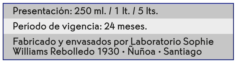 - Sólo uso externo. No exponer a altas temperaturas. Almacenar a temperatura ambiente en lugar fresco y seco. Producto inflamable.